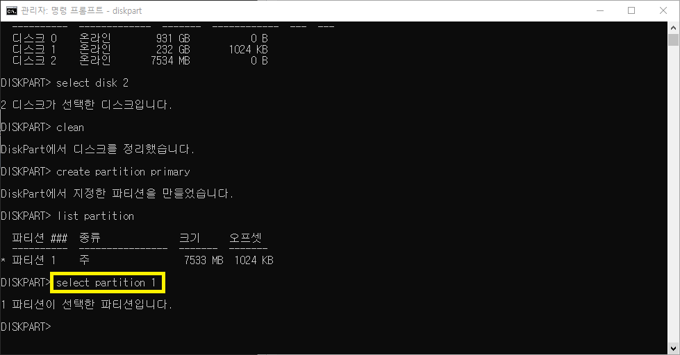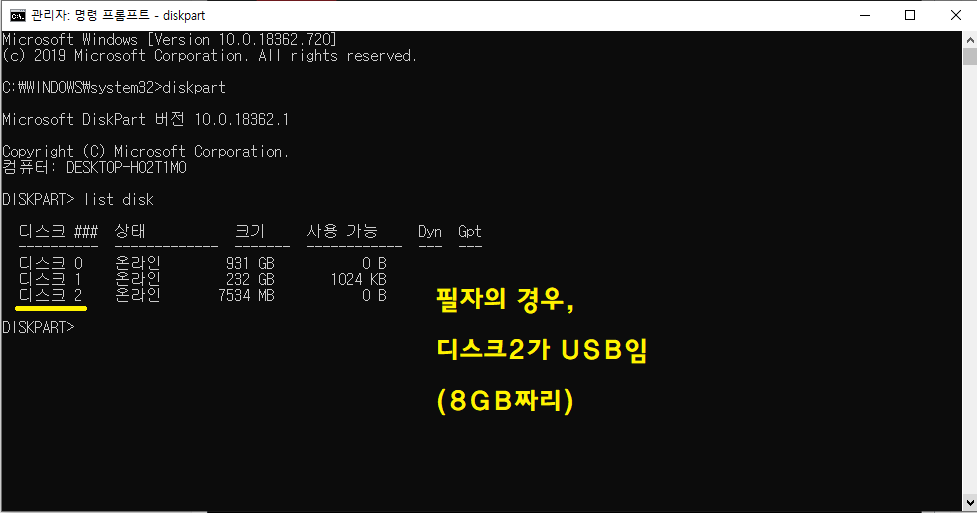 : 필자의 경우 디스크2 가 USB였어서 select disk 2를 입력한 것이고, USB가 디스크1로 되어 있으시면 select disk 1을 입력하시면 됩니다.