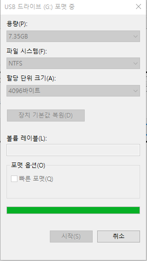 여기서 중요한 건 cmd의 diskpart 명령어로 실패했던 파일 시스템 형식인 "NTFS"로 선택해주시고, 빠른 포맷에 체크를 해제해주어야 한다는 점입니다. 시작을 눌리면 시간이 제법 걸립니다. 느긋하게 기다려주세요.