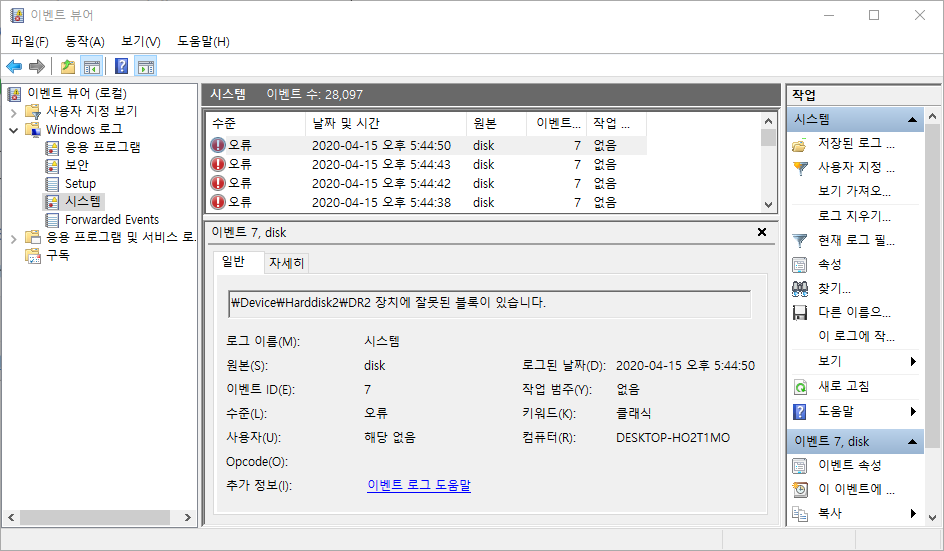 : 위 스크린샷에서 "Diskpart에서 다음 오류가 발생했습니다. 매개 변수가 틀립니다. 자세한 내용은 시스템 이벤트 로그를 참조하십시오." 라는 문구가 나왔습니다.