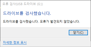 위 사진에 있는 것 처럼 팝업창에서 무언가 버튼을 누르라고 권장하고 있는 것 같은데, 누르지 말아주세요. 어차피 [스캔 및 수정(권장)]을 누르면 "이 드라이브에서 오류가 발견되었습니다. 데이터 손실을 방지하려면 이 드라이브를 지금 복구하십시오." 라는 팝업이 뜨게되고, 드라이브 복구를 하라고 합니다. 복구를 누르면, "드라이브 검사했습니다. 오류가 발견되지 않았습니다." 라고 팝업창이 뜹니다.